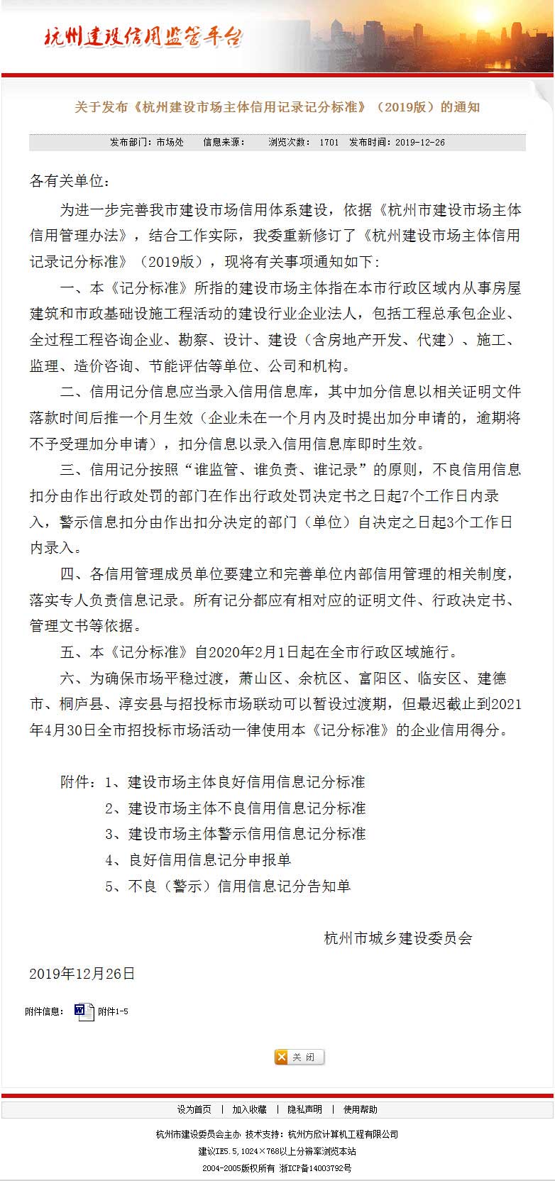 转发市建委“关于发布《杭州建设市场主体信用记录记分标准》(2019版)的通知”